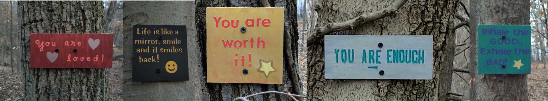 So, how could I give inspiration and encouragement when I wasn't even sure who these people were? I knew that they walked through this path, so I made some signs with short, positive messages on them, and put them up throughout the ravine. The signs say things like "You are worth it!", "Inhale the good, Exhale the bad" and "Believe in Yourself!"