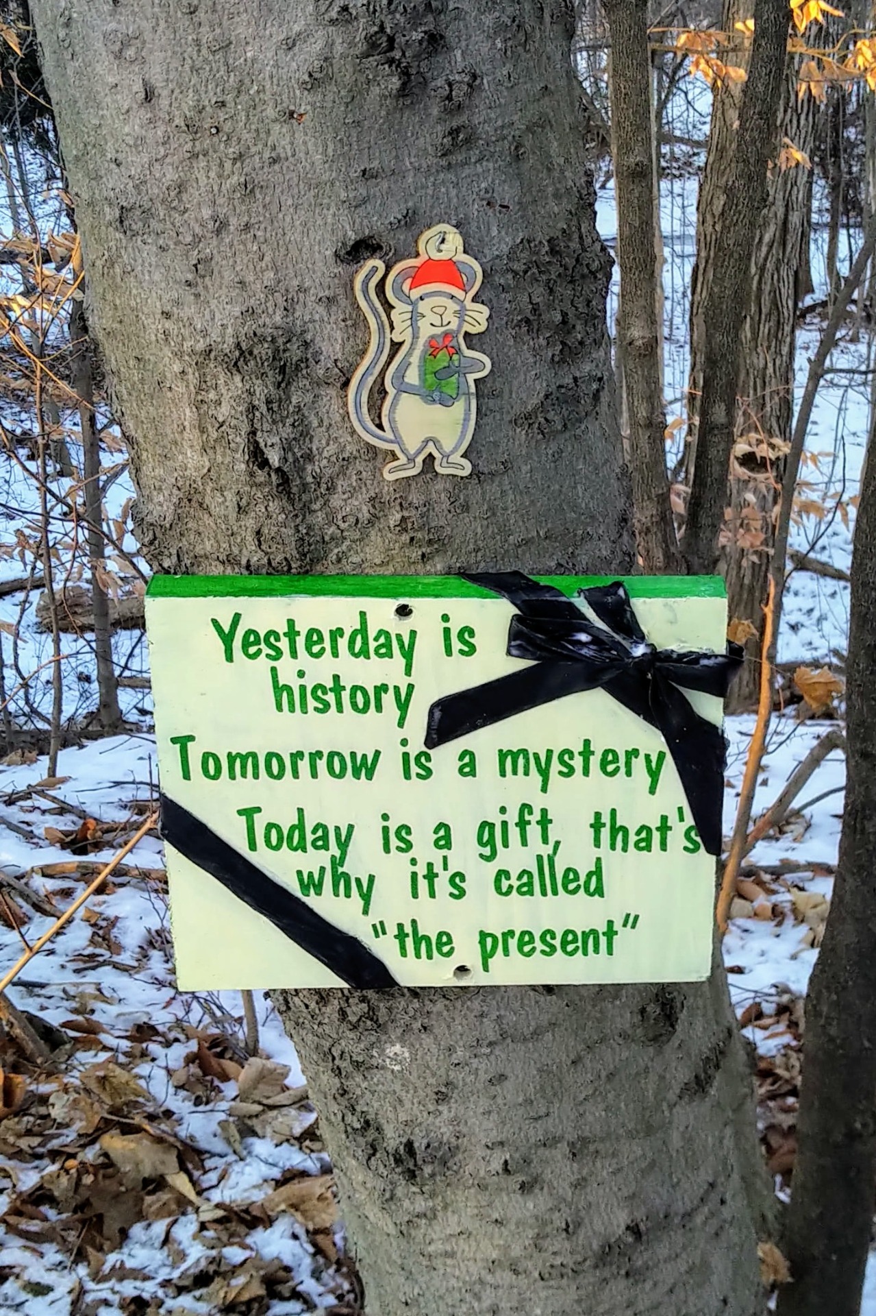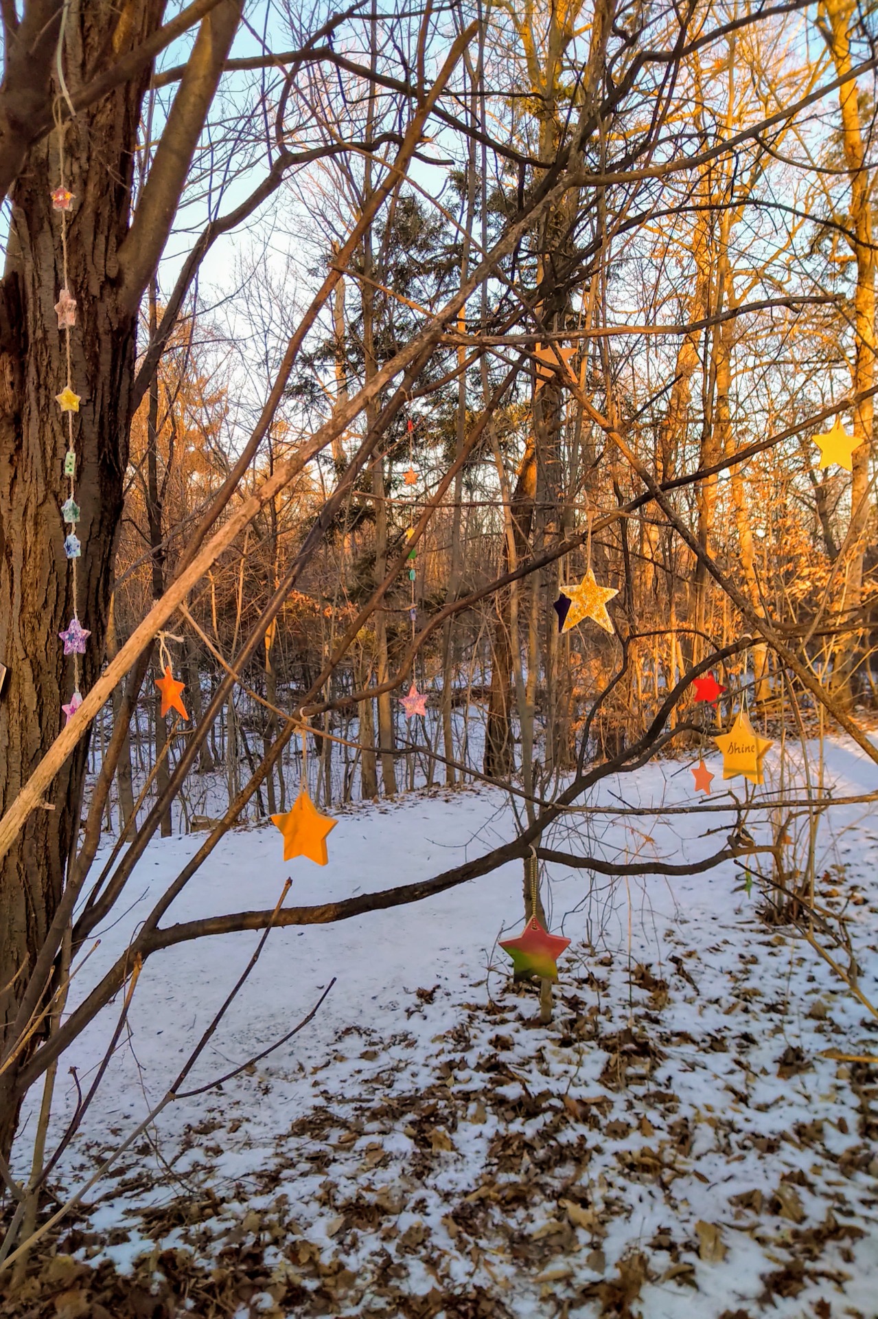 Since the signs have been up, we've been pretty lucky! I haven't seen anything that's been destroyed, except for a few small weather related things that were an easy fix. Other people have also started to catch on to the idea! Someone went through and hung Christmas balls on branches all throughout, and there have been some other decorations that we've seen pop up in various places- a couple of snowmen, and some fancy, blue and white icicle candy canes. I love that it's becoming a project for the entire community and that so many people can walk through and enjoy it.