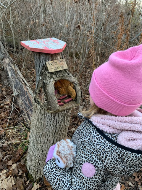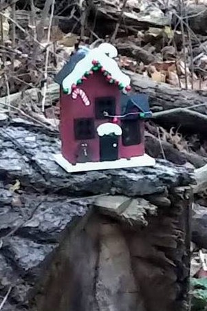 I went out to the dollar store and bought some little wooden houses, animal figures and trees. I brought them home and painted/decorated them and then took them out to the ravine near my house. I knew there would be certain youth and adolescents who would walk through and be tempted to break things, so my dad helped me actually screw or nail most of the things right into the wood.